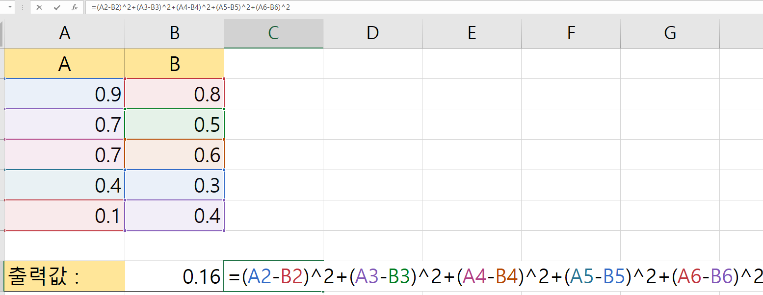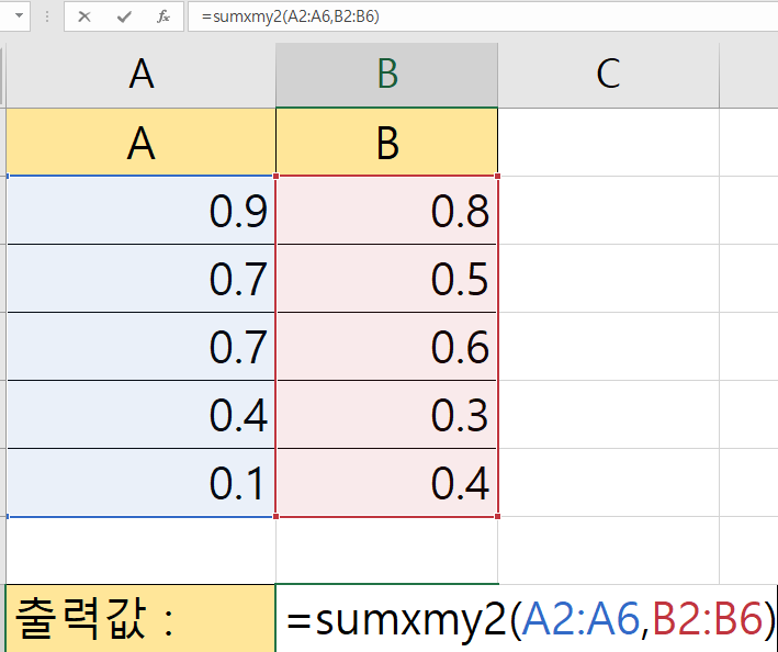 즉 SUMXMY2함수는 (X-Y)² 를 전부 더한 것으로 볼 수 있다. 즉 식으로 나타내면 아래처럼 볼 수 있겠다.